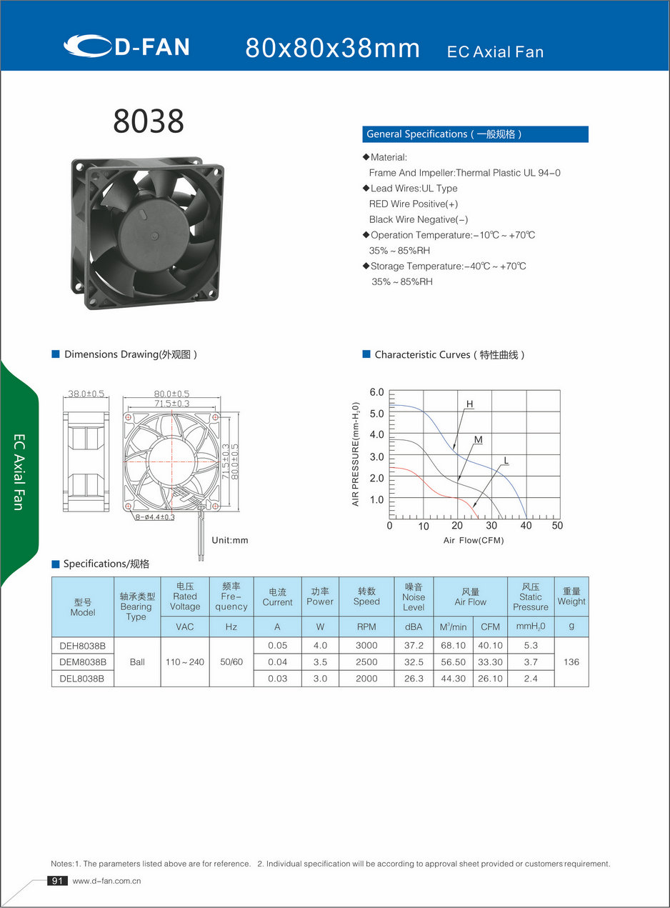 EC軸流風(fēng)扇-8038就是與風(fēng)葉的軸同方向的氣流,如電風(fēng)扇,空調(diào)外機(jī)風(fēng)扇就是軸流方式運行風(fēng)機(jī)。之所以稱為“軸流式”,是因為氣體平行于風(fēng)機(jī)軸流動。軸流式風(fēng)機(jī)通常用在流量要求較高而壓力要求較低的場合。軸流式風(fēng)機(jī)固定位置并使空氣移動。 根據(jù)軸流風(fēng)扇的特性做出以下分類: 按材質(zhì)分類:鋼制風(fēng)機(jī)、玻璃鋼風(fēng)機(jī)、塑料風(fēng)機(jī)、PP風(fēng)機(jī),PVC風(fēng)機(jī),鎂合金風(fēng)機(jī)、鋁風(fēng)機(jī)、不銹鋼風(fēng)機(jī)等等。 按用途分類:防爆風(fēng)機(jī)、防腐風(fēng)機(jī)、防爆防腐風(fēng)機(jī)等類型。 按使用要求分類:管道式、 壁式、崗位式、固定式、防雨防塵式、 電機(jī)外置式等。 EC軸流風(fēng)扇-8038圖示 EC軸流風(fēng)扇-8038曲線外觀圖 EC軸流風(fēng)扇-8038外觀圖 EC軸流風(fēng)扇-8038參數(shù)
